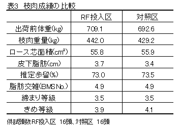 枝肉成績については、枝肉重量がRF投入区は対照区に対して大きい傾向がみられた。(表3)