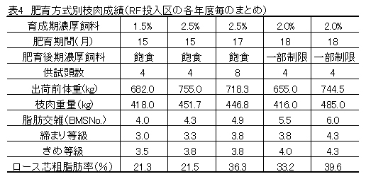表4 肥育方式別枝肉成績(RF投入区の各年度毎のまとめ)