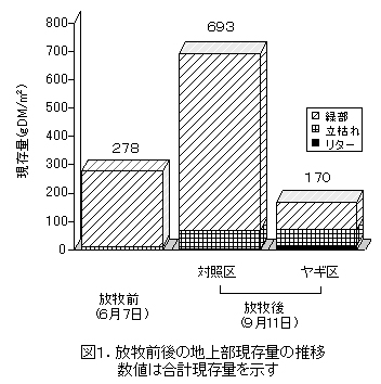 - ヤギ放牧によって地上部現存量は、放牧しなかった対照区の23%まで低下し、リター(地表有機物)を含めた地上可燃物も170gDM/m2ときわめて少ない(図1、表1)。