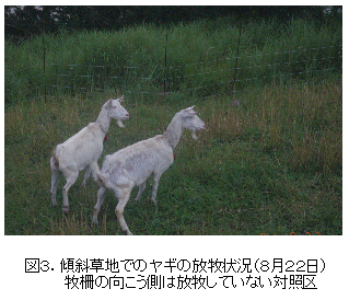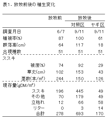 ヤギ(ザーネン系雑種、約40kg/頭)3頭を、この草地内に6月上旬から約3ヶ月間放牧する(295頭・日/10a)ことにより、植物群落の被度は61%、高さは18cmまで低下する(表1)。とくに最優占種であるススキの被度、草丈の低下は著しい。