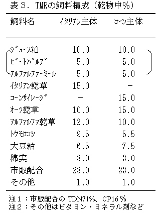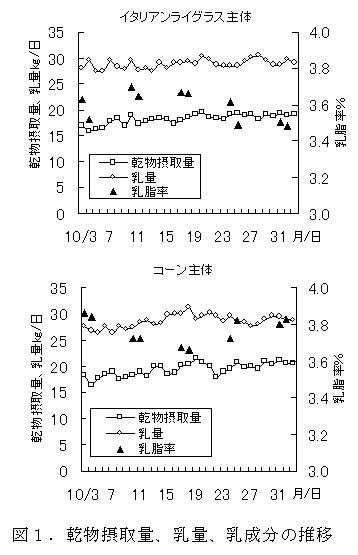 上記の飼料をイタリアンライグラス乾草主体またはコーンサイレージ主体のTMRに20%の割合で混合調製し(表3)、泌乳中期のホルスタイン種泌乳牛2頭ずつに1ヶ月間給与した結果、乾物摂取量、乳量および乳成分に異常は認められない(図1)。