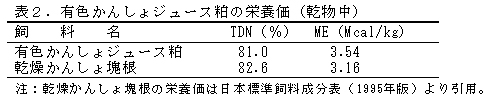 有色かんしょ粕の飼料成分は、粗蛋白質含量が2.57%と低いが、可溶無窒素物含量が93%と多い(表1)。また、栄養価は、TDN含量が81%で、高カロリー・低蛋白質の飼料である(表2)。