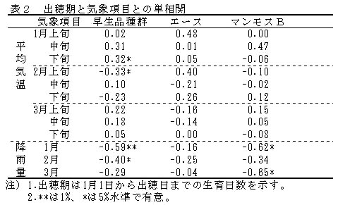 出穂(1月1日から出穂までの生育日数)と高い相関が認められる気象要素は、早生品種群が1月中旬から2月上旬の平均気温と1月と2月の降水量、「エース」が1月上旬と2月上旬の平均気温、「マンモスB」が1月中旬の平均気温および1月から3月までの降水量である(表2)。