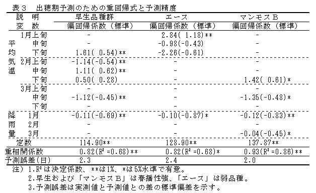 早生品種群(「タチワセ」、「ワセアオバ」、「ワセユタカ」)の出穂に要する日数は、1月下旬、2月上・中・下旬、3月中旬の各平均気温及び1月降水量を説明変数とする重回帰式により求められる(表3)。