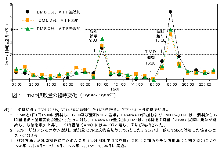 - TMR(混合飼料)方式による飼料調製・給与においては、採食性が高まると言う理由から乾物率は50〜60%に調製される場合が多い。しかし、夏期にはTMRが発熱・変敗し摂取量が減少する等の問題が生じている。1997年度の試験において、夏期にTMRを乾物率80%に調製した場合、発熱が抑制されるとともに調製後48時間までの採食率は低下しないことを乾乳牛を用いて明らかにした。そこで、夏期におけるTMR乾物率の違いが泌乳牛の乾物摂取量および泌乳性に及ぼす影響を明らかにする。