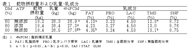 TMRの乾物率が80%であっても、1日の乾物摂取量および乳量は乾物率60%ATF無添加および乾物率60%ATF添加のTMRと変わらない(表1)。