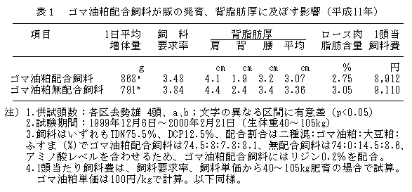 表1 ゴマ油粕配合飼料が豚の発育、背脂肪厚に及ぼす影響(平成11年)