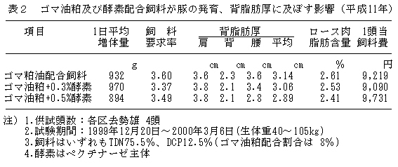 表2 ゴマ油粕及び酵素配合飼料が豚の発育、背脂肪厚に及ぼす影響(平成11年)
