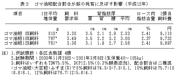 表3 ゴマ油粕配合割合が豚の発育に及ぼす影響(平成12年)