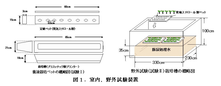 - 15l容(縦:21cm×横:65cm×高さ:18cm)のプランタに豚尿処理水を入れ、この中に栽培ベッドとして6.5cm間隔で孔を空けた発泡スチロール板を浮かべたバッチ式栽培試験(以下試験I)と、7.6m3の栽培槽(ブロック製)に、処理水を約2.6m3投入し、試験期間中を通して定期的(7日間隔)に全量入れ替えを行う連続的入れ替え栽培試験(以下試験II)を行った(図1)。栽培試験区は次の3区を設けた。: