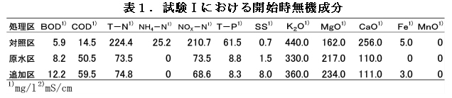 - 汚水処理水に無機成分(K2O、Fe等)を追加した溶液を使用(追加区)(図1、表1)。