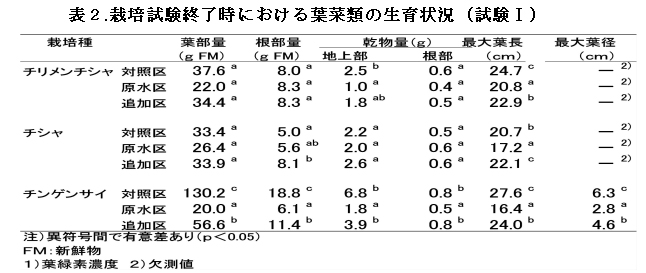 表2 栽培試験終了時における葉菜類の生育状況(試験I)