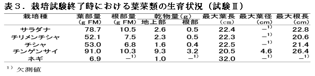表3 栽培試験終了時における葉菜類の生育状況(試験II)