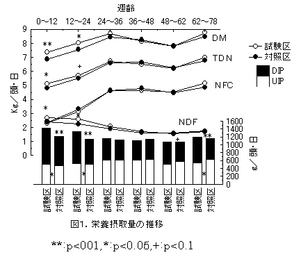 肥育前期にDIPが高い濃厚飼料を定量給与すると、粗飼料の採食量が増加し増体性が向上するともに、肥育後期にDIP及びNFC割合を高めると、増体量が多く、枝肉重量が増加し、脂肪交雑が向上する傾向を示す。
