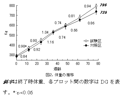 一般に、雌牛は去勢牛より増体が劣り体内に脂肪が沈着しやすいため、筋肉組織の発達を目的に肥育前期にはCP水準を高め、粗飼料多給した方がよいといわれている。DIP(分解性蛋白質)のサプリメントは繊維分解菌を増殖させ、粗飼料摂取量が多くなるとされる。また、飼料エネルギーの摂取効率を最大にするにはエネルギーに見合ったDIPが必要だともされている。そこで、卵巣除去した黒毛和種雌牛の肥育前期及び後期に大豆粕を主体に、DIP水準を高めた濃厚飼料を給与し、肥育に及ぼす影響を調査する。