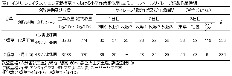 表1 イタリアンライグラス・エン麦混播草地における小型作業機体系によるロールベールサイレージ調製作業時間