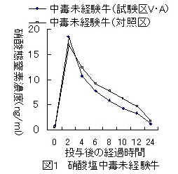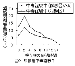 急性硝酸塩中毒経験牛(硝酸ナトリウム1回投与後、10日後に再投与し中毒した牛で以下、経験牛)では、ビタミンAを投与しても硝酸塩投与に対する血漿中硝酸態窒素濃度の上昇は抑制されない(図2)。