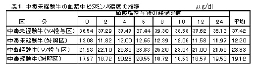 未経験牛では、ビタミンA300万単位の投与により、中毒血漿中ビタミンA濃度が12.20μg/dlから37.42μg/dlに約3倍上昇するが、経験牛では19.92μg/dlから23.83μg/dlとほとんど上昇しない(表1)。