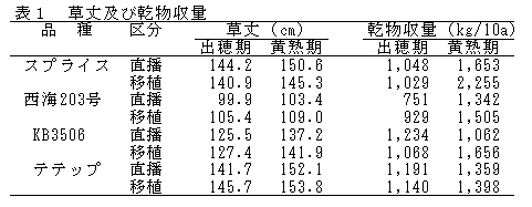 - 黄熟期での乾物収量は移植区でスプライス>KB3506>西海203号>テテップ、直播区ではスプライス>テテップ>西海203号>KB3506である(表1)。4品種(系統)とも直播区より移植区で多収である(表1)。