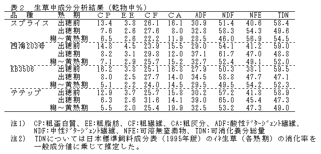 品種(系統)、播種時期、刈り取り時期別による飼料成分組成については、粗蛋白質、粗脂肪はステージが進むにつれて低下するが、可溶無窒素物はステージが進むほど高くなる(表2)。また、推定TDN含量は49〜54%となる(表2)。