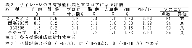 Vスコアによるサイレージの品質評価は、スプライスが61点で可、西海203号が94点で良、KB3506が93点で良、テテップが85点で良である(表3)。