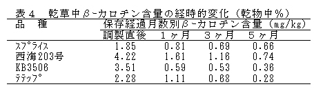 調製直後の乾草中のβ-カロチン含量は1.85〜4.22mg/kgと品種による違いがみられ、4品種(系統)とも保存1ヶ月目で調製直後の半分以下に減少する(表4)。