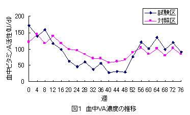 試験区の血中VA濃度は、試験開始から12週で急激な減少傾向を示し24週で50IU/dl以下となった。なお、血中VA濃度低下時に、日本飼養標準要求量の50%量のVA製剤2週間添加を2ヶ月間隔で3回程度実施することで血中VA濃度40IU/dl程度を維持した。(図1)