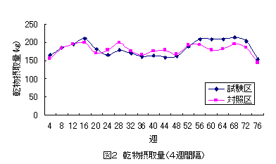 乾物摂取量は、試験開始後20〜52週にかけて試験区が対照区より低く推移し、52週以降は試験区が対照区より高く推移した。(図2)