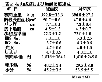 - 胸最長筋面積は試験区50.7±0.6cm2、対照区47.0±4.6cm2,脂肪交雑(BMS)は試験区8.0±1.0、対照区5.3±2.5となったが有意な差はなかった。また、肉色(BCS)、光沢、きめ、締まりなどの肉質においても有意な差はなかった。(表2)