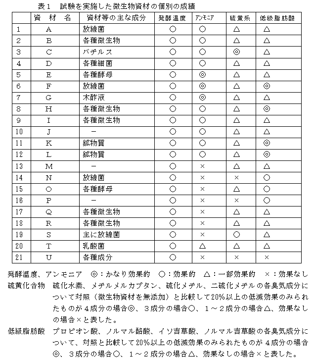 県内では肉用牛・乳用牛・豚・採卵鶏・肉用鶏農家で60種類以上の微生物資材等が流通している。このうち21種類の放線菌・乳酸菌・複数の菌を混合したもの・木酢液を利用したもの等の脱臭資材を購入し、小型堆肥化装置で堆肥化した(表1)。