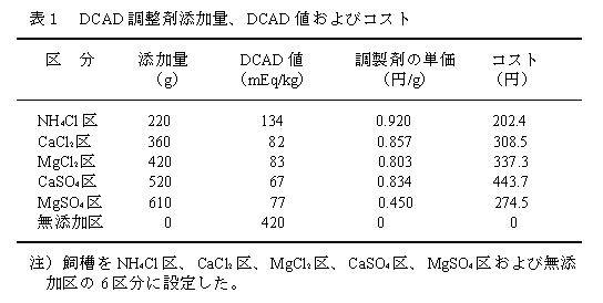 - DCAD調製添加量の多い順ではMgSO4区>CaSO4区>MgCl2区>CaCl2区>NH4Cl区で、DCAD値は無添加区が420mEq/kgで、添加区は67mEq/kgから134mEq/kgの範囲である。また、コストの高い順ではCaSO4区>MgCl2区>CaCl2区>MgSO4区>NH4Cl区である(表1)。