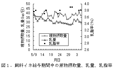図1 飼料イネ給与期間中の原物摂取量、乳量、乳脂率