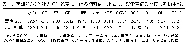 表1 西海203号と輸入チモシー乾草における飼料成分組成および栄養価の比較(乾物中%)