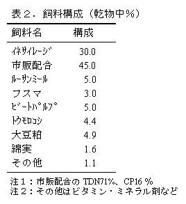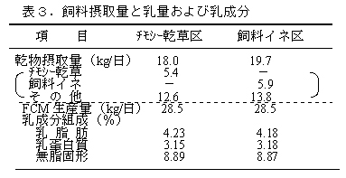 イネサイレージとチモシー乾草を乾物中にそれぞれ30%ずつの割合で混合した飼料(表2)を用いて泌乳牛4頭ずつの代謝試験を行ったところ、乳量や乳成分に違いは認められない。