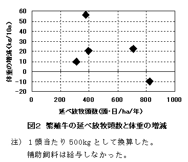 繁殖牛を放牧する際には、800頭・日/ha/年放牧すると牛の体重が減少する場合があるので、600頭・日/ha/年程度が適切である(図2)。
