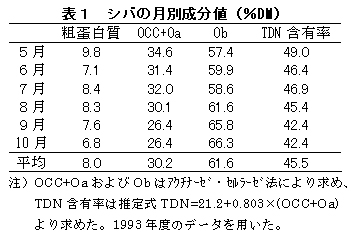 無施肥条件下のシバの粗蛋白質およびTDN含有率は春高く、夏から秋にかけて低い傾向を示し、粗蛋白質は7〜10%、TDN含有率は42〜50%の範囲内にあるので、繁殖牛には適しているが、育成牛には補助飼料を給与する必要がある(表1)。