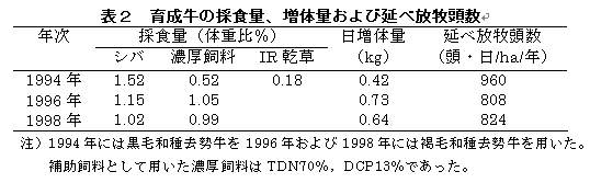 表2 育成牛の採食量、増体量および延べ放牧頭数