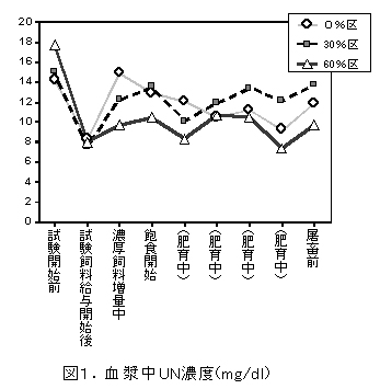 サツマイモ主体飼料は尿素が0.9%配合されていたものの、60%区の血漿UN濃度が低い値で推移した(図1)。サツマイモ主体飼料中の粗蛋白は有効に利用される。
