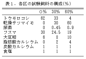 乾燥サツマイモに対し、エネルギー補給のための脂肪酸カルシウムと、反芻胃内での急激な乳酸発酵を中和する易発酵性窒素源としての尿素を添加することにより、良好な肉牛肥育用の濃厚飼料(風乾物中TDN73%,CP12%)となる(表1)。