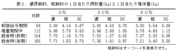 表2 濃厚飼料、粗飼料の1日当たり摂取量(kg)と1日当たり増体量(kg)