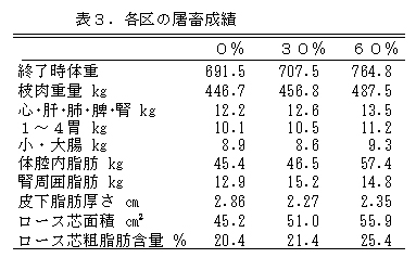 サツマイモ主体飼料の給与により大きな枝肉が生産される(P=0.068)。皮下脂肪はトウモロコシ主体の0%区でやや厚く、逆に体腔内脂肪は60%区で多い傾向を示す(表3)。