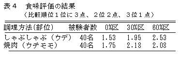 首都圏の主婦80人を対象にした食味評価では、しゃぶしゃぶ(ウデ部位)、焼肉(ウチモモ部位)のいずれの調理方法においても、30%区および60%区の牛肉の評価順位が優れた(表4)。すなわち、サツマイモ主体飼料で生産された牛肉は良好な食味性を有する。