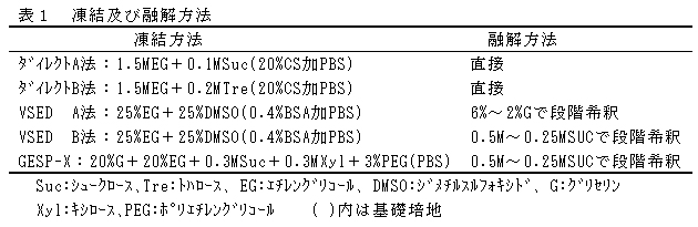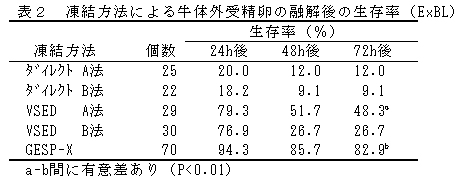 表2 凍結方法による牛体外受精卵の融解後の生存率(ExBL)