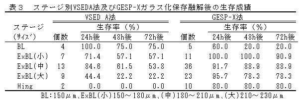 表3 ステージ別VSEDA法及びGESP-Xガラス化保存融解後の生存成績