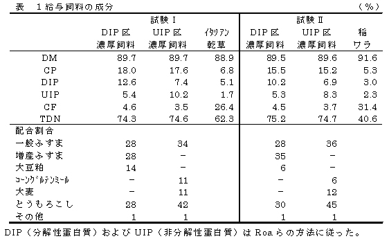 消化試験ストールに繋養した黒毛和種去勢牛2頭(試験I:平均253kg,9ヶ月齢;試験II:平均343kg,12ヶ月齢)を用い、DIP割合の異なる濃厚飼料を制限給餌(試験I:体重比1.4%;試験II:体重比1.7%)、粗飼料(試験I:イタリアン乾草;試験II:稲ワラ)を不断給餌し、1期11日の採食量と試験終了前4日の消化率を調査した。両試験とも2期に試験期間を分け、給与する濃厚飼料は各期に試験牛を反転して比較した(表1)。