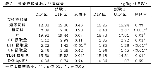 粗飼料としてイタリアン乾草を給与する場合は、DIP割合が異なる濃厚飼料を給与しても粗飼料の採食量は変わらないが、稲ワラを給与する場合はDIP割合が高い濃厚飼料を給与すると粗飼料の採食量が多くなる(表2)。