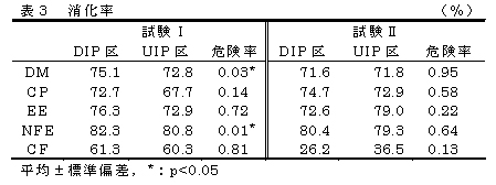 稲ワラを給与する場合、CF消化率がやや劣る傾向にあった。しかし、濃厚飼料のDIP割合が異なってもDM、CP、EE、およびNFE消化率に大きな差は認められなかった(表3)。