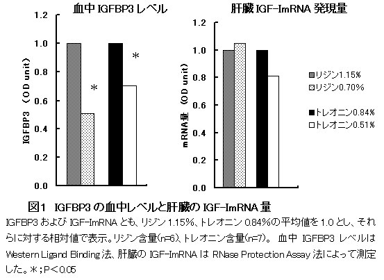 飼料中の必須アミノ酸であるリジンあるいはトレオニン濃度を低下させると、インスリン様成長因子-I(IGF-I)とIGF結合蛋白質3(IGFBP3)の血中濃度は低下するが、肝臓におけるIGF-IのmRNA発現量は変化しない。