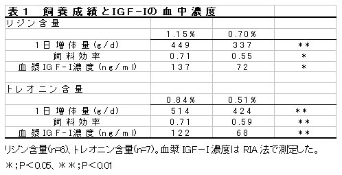 同様に、トレオニンの飼料中含量が要求量を満たしていない飼料(トレオニン含量0.51%)を、6週齢の雄子豚に3週間給与すると、要求量を満たした飼料(同0.84%)を給与した豚に比較して、増体量、飼料効率およびIGF-IとIGFBP3の血中濃度が低下する(表1と図1)。