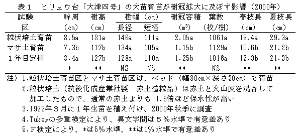 表1 ヒリュウ台「大津四号」の大苗育苗が樹冠拡大に及ぼす影響(2000年)